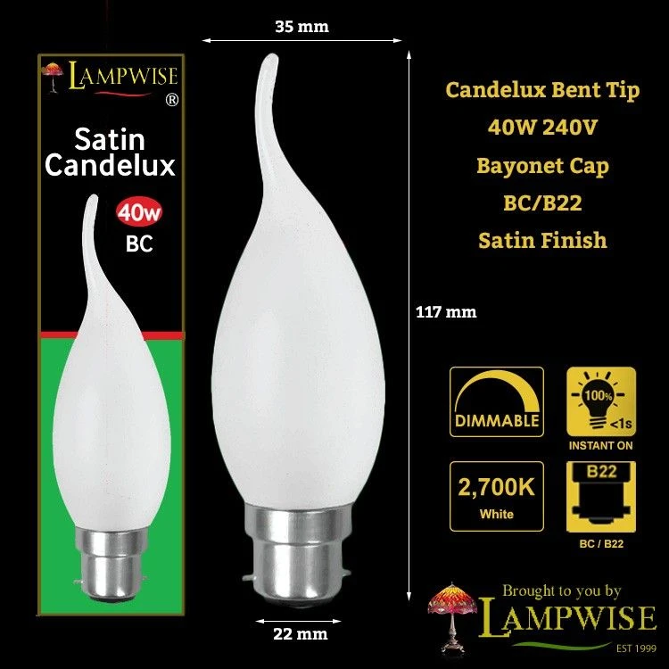 Lampwise branded satin frosted decorative 35mm candle shaped light bulb with a bent tip.
