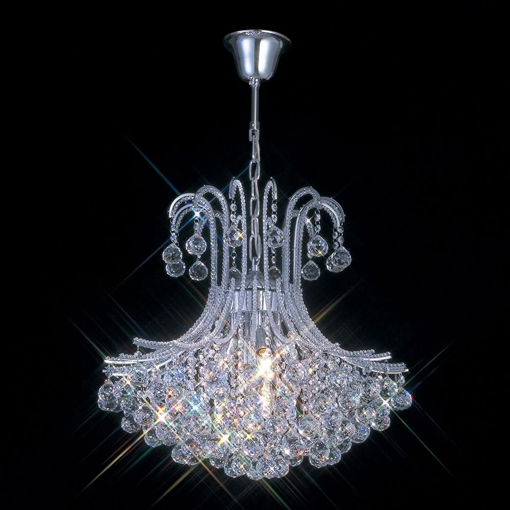 The Bask is a 6 light pendant round light by Diyas with Polished Chrome finish and crystal glass shades. It requires 6x 60W max E14 light bulbs which can be candle.