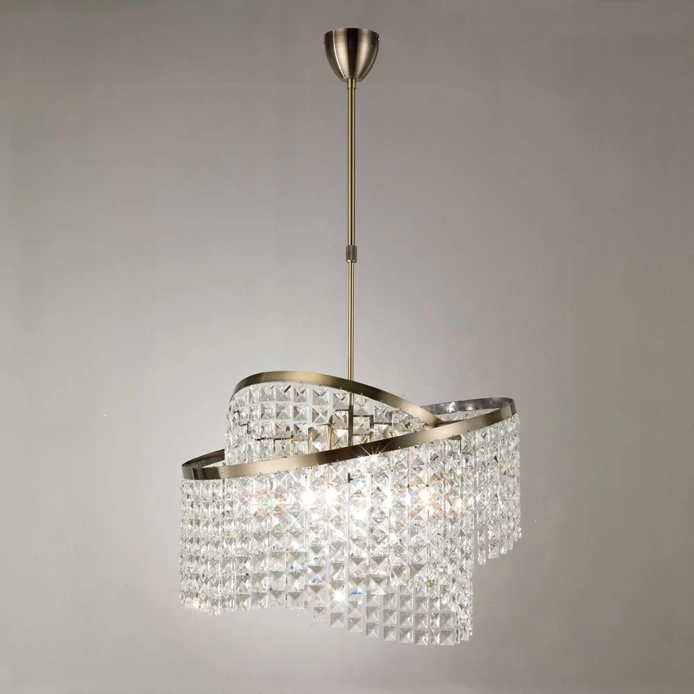 A delightful twin ring Antique Brass selection fully loaded with string of brilliant Asfour crystal squares.As each ring can be rotated individually, various designs can be established from the one item.The inner cords of crystal are larger in length than the outer ring thus establilshing a more particular family of light fittings.Telescopic suspensions were preferred to give the items a more define and new arrival.