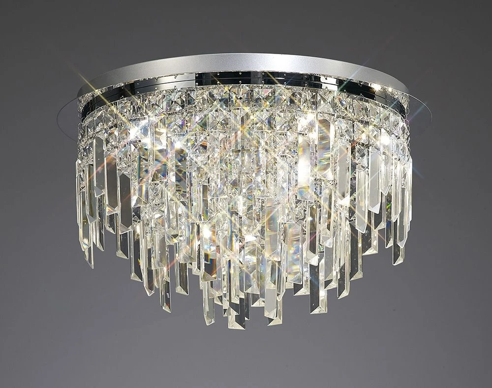 The Maddison is a 6 light round ceiling lamp by Diyas with Polished Chrome finish and crystal glass shades.It requires 6 x 33W max G9 light bulbs which can halogen or LED.
