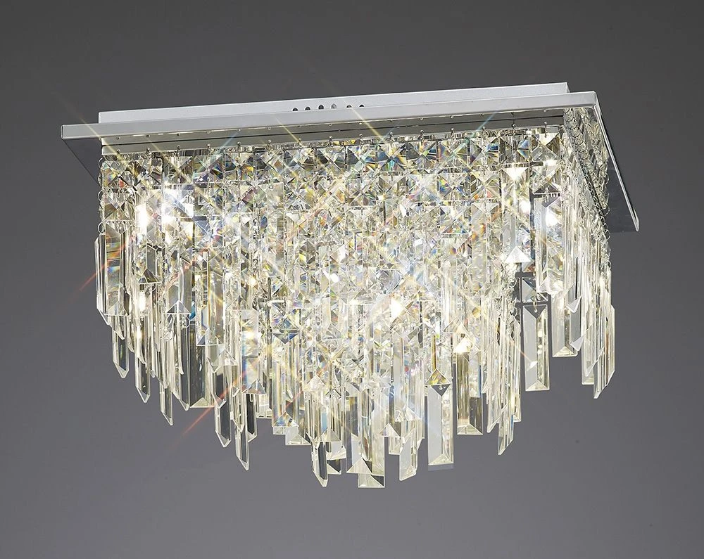 The Maddison is a 6 light square ceiling lamp by Diyas with Polished Chrome finish and crystal glass shades.It requires 6 x 33W max G9 light bulbs which can halogen or LED.