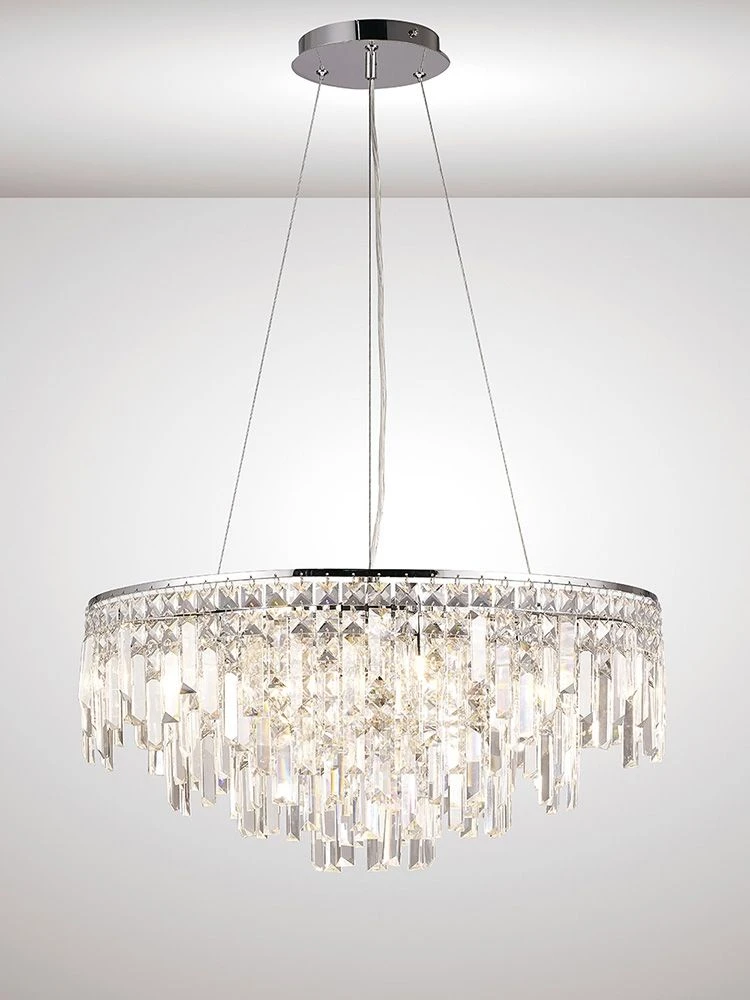 The Maddison is a 8 light round pendant lamp by Diyas with Polished Chrome finish and crystal glass shades.It requires 8 x 33W max G9 light bulbs which can halogen or LED.