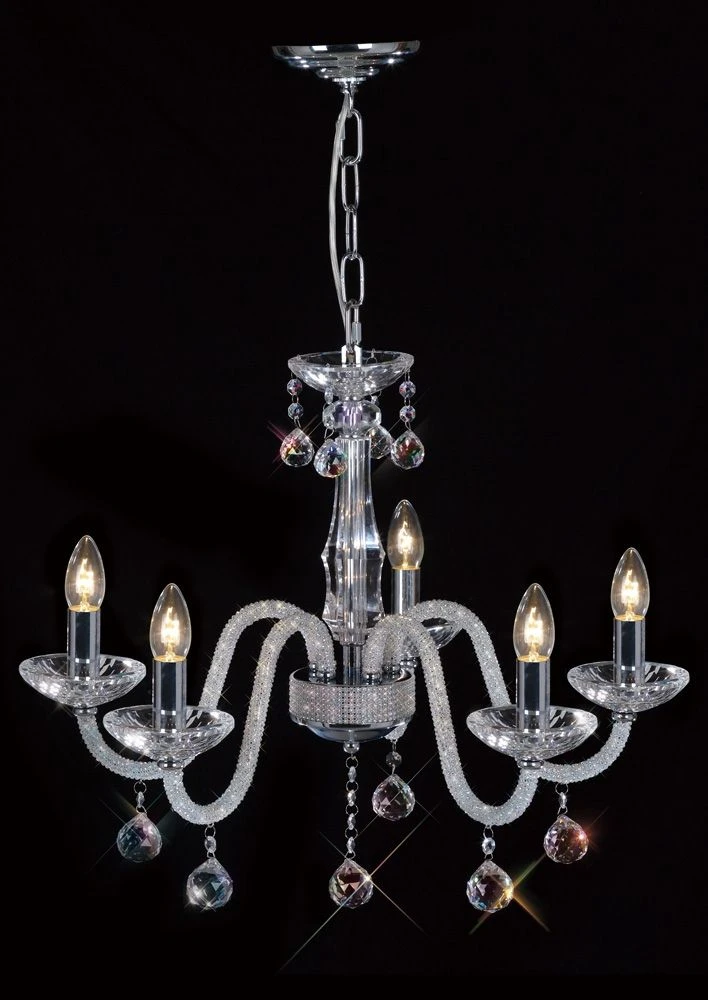 The Amora is a 5 Light Pendant Lamp by Diyas with Polished Chrome finish and crystal shades.It requires 5 x 60W max E14 light bulbs which is Candle.