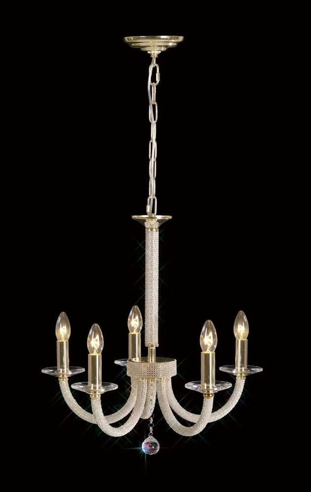 The Elena is a 5 Light Pendant lamp by Diyas with Gold finish and crystal shade.It requires 5 x 60W max E14 light bulbs which can be Candle.