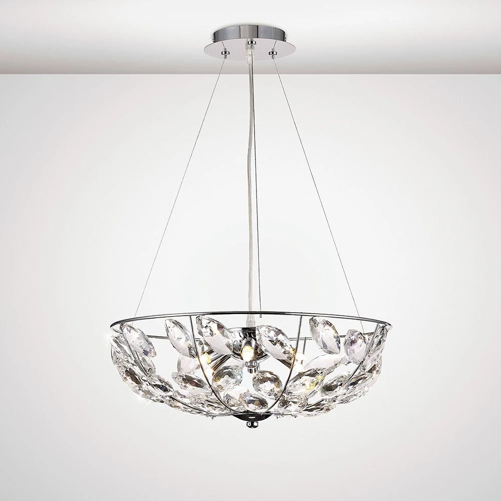 The Galilea is 6 Light Pendant Light by Diyas with Polished Chrome finish and Crystal shades. It requires 6 x 33w max G9 light bulbs which is Halogen or LED.