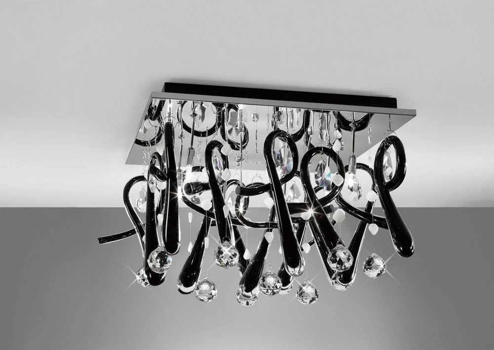 A magnificent variety of round and square Polished Chrome flush fixtures.They are dressed with sizable looped hand crafted clear glass that has either White or Black gloss resin occupied within.Strings of Asfour crystal spheres and contrasting glass stones are suspended through the fittings in coordination with the encircled glass.The final outcome is attractive .Compatible dimmer switches are available upon demand.