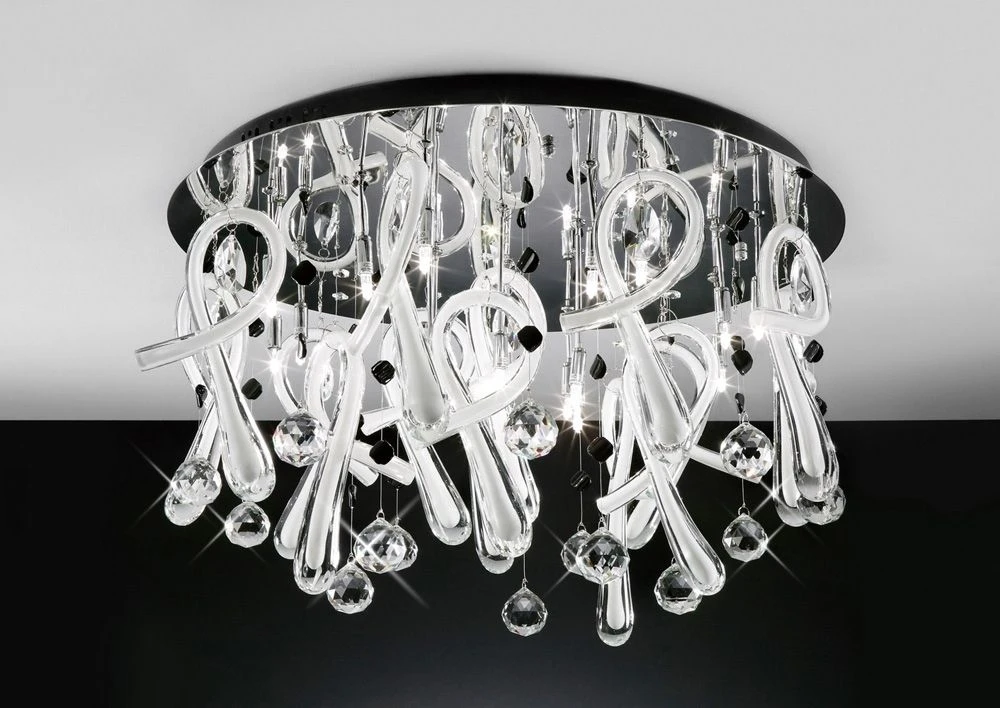 A magnificent variety of round and square Polished Chrome flush fixtures.They are dressed with sizable looped hand crafted clear glass that has either White or Black gloss resin occupied within.Strings of Asfour crystal spheres and contrasting glass stones are suspended through the fittings in coordination with the encircled glass.The final outcome is attractive .Compatible dimmer switches are available upon demand.