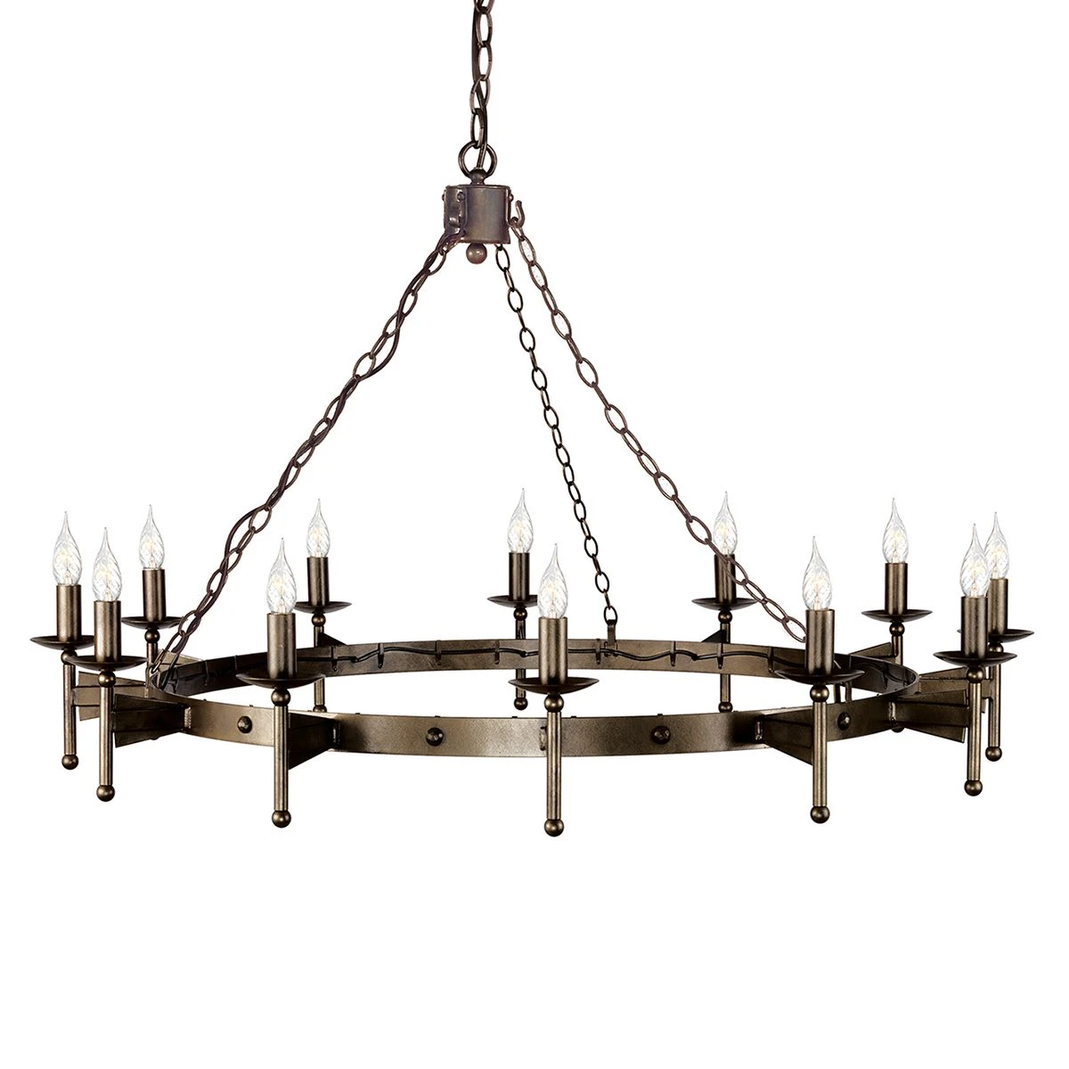 CW12 OLD BRZ Twelve light chandelier. Max weight: 14kg – Part of the Cromwell Range by Elstead Lighting.
