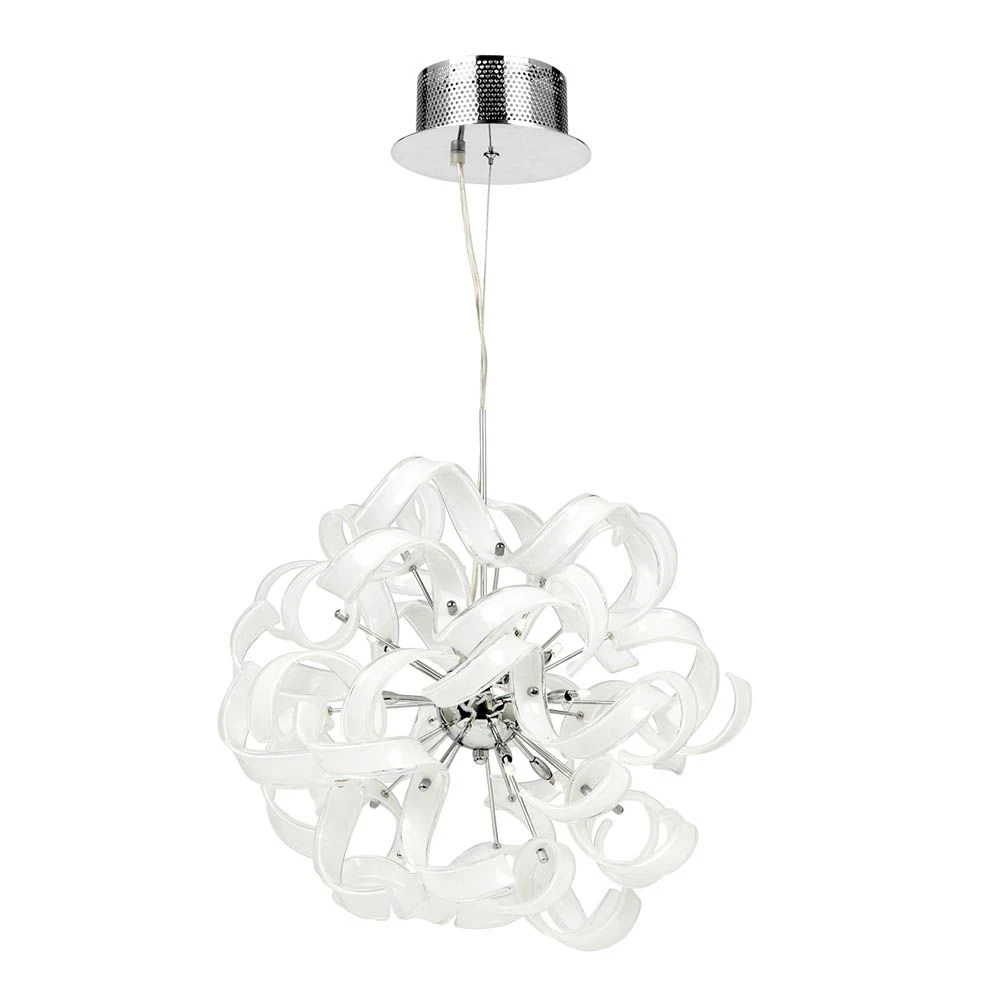 A 9 light pendant with white ribbon style glass and a polished chrome fitting. Height adjustable at time of fitting