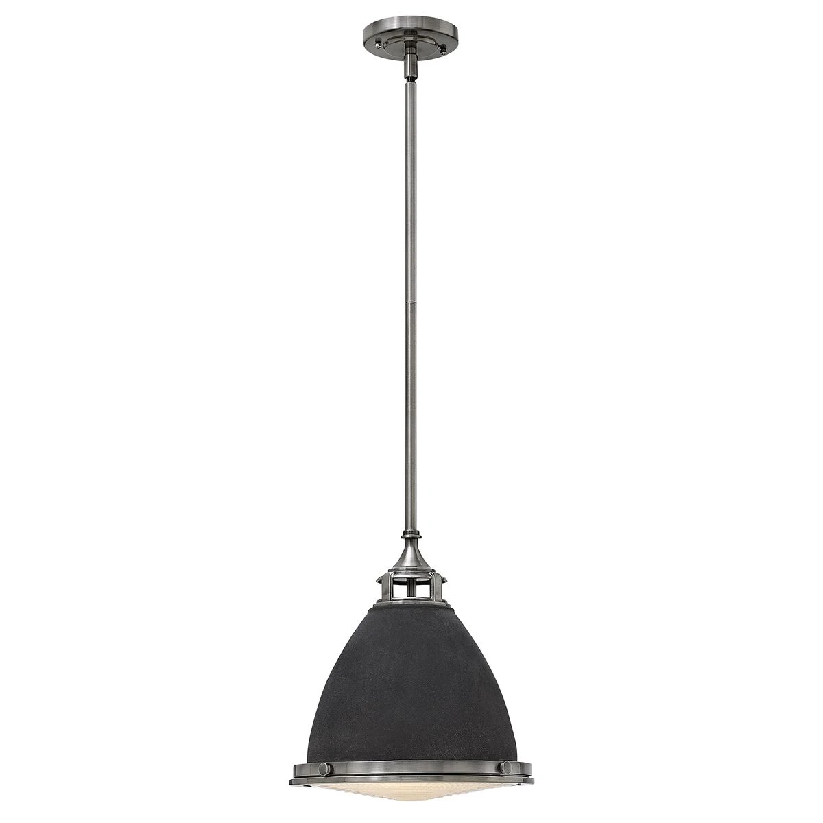 Amelia’s classic pendant design reinvents vintage details with a cast glass fitter, cast metal trim ring and prominent hinges and clasps. The etched opal glass dome has an etched prismatic bottom lens for classic retro inspiration, while the full metal body versions have a more vintage appearance to them.