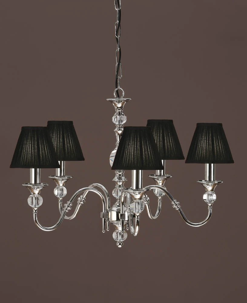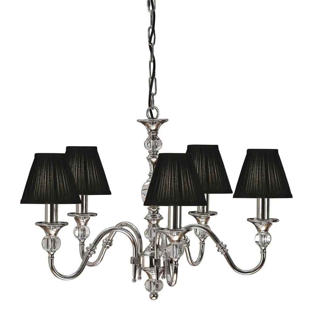 The Polina Nickel 5-light pendant is an elegant addition to any room. Finished in a polished nickel plate and adorned with k9 crystal glass detailing and black organza effect shades to give it an opulent feel