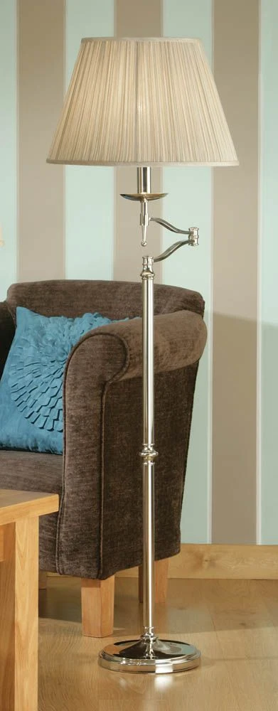 The Stanford nickel swing arm floor light is finished in polished nickel and teamed with a beige shade, giving it a classical twist on its contemporary styling. The swing arm offers extra functionality for ease of directing light. Matching items available