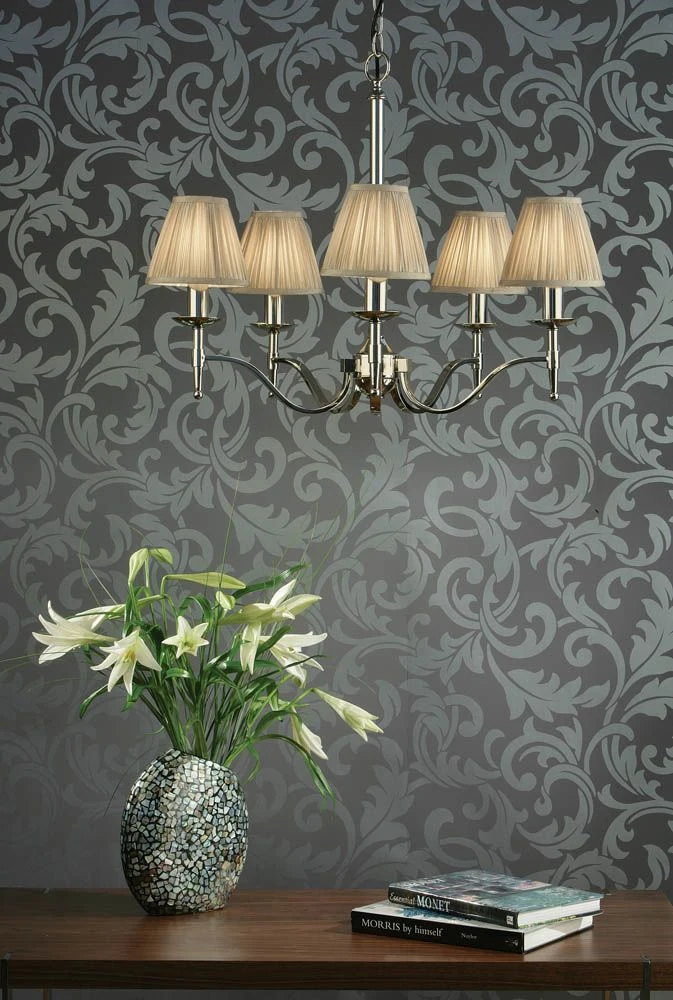The elegant 5 light pendant from the Stanford nickel range has beautifully curved arms and simple clean detailing. Its complemented by pretty, beige organza effect shades. Matching items available