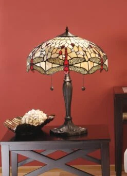 The Dragonfly medium table lamp in beige is a traditional interpretation of the iconic Tiffany Dragonfly design, in natural muted colours with coloured glass beading and teamed with a dark bronze effect fitting. Compatible with LED lamps and matching items available