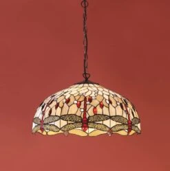 The large Dragonfly pendant in beige is a traditional interpretation of the iconic Tiffany Dragonfly design, in natural muted colours with coloured glass beading and teamed with a dark bronze effect fitting. Compatible with LED lamps, dimmable and matching items available