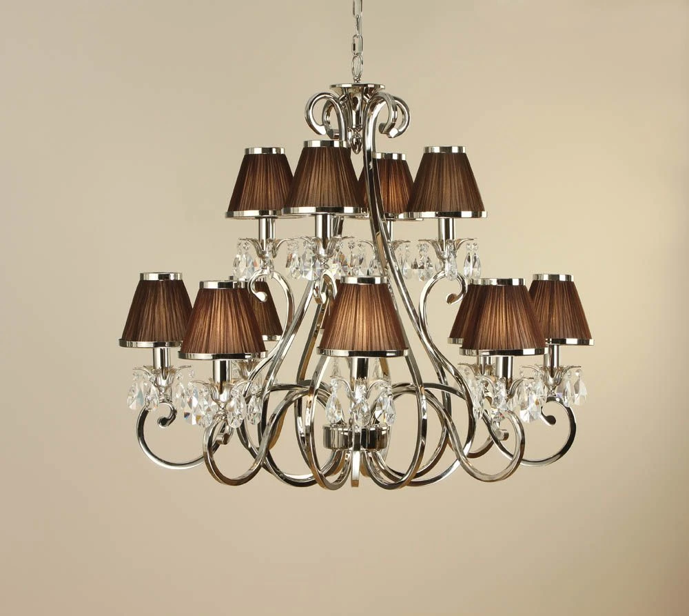 A 12 light pendant from the Oksana nickel range. Features faceted lead crystal droplets and chocolate pleated shades with a polished nickel trim. Matching items available and compatible with LED lamps