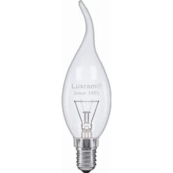 Luxram 028702025 220-240V 25W clear bent tip candle light bulb. Life span 1,000 hours.