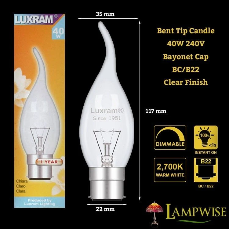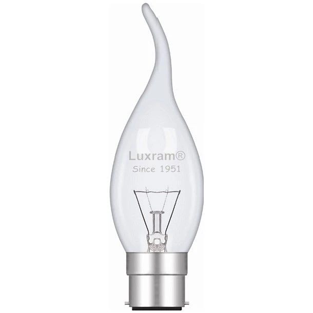 Luxram 40 Watt Clear BC B22 Bayonet Cap Bent Tip Candelux