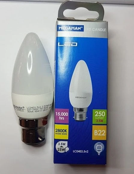 Long life 15,000 hours energy-saving LED by Megaman. Standard 35mm candle shaped light bulb with the large bayonet cap (BC/B22). Please note this light bulb is not dimmable.