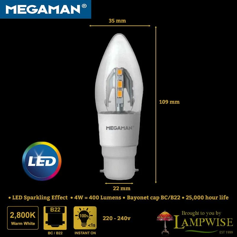 Energy saving LED candle light bulb by Megaman features 400 lumens at only 4 watts. A long lasting 25,000 average life light bulb with warm white sparkling light effect. This light bulb has bayonet cap BC/B22 and is not dimmable.