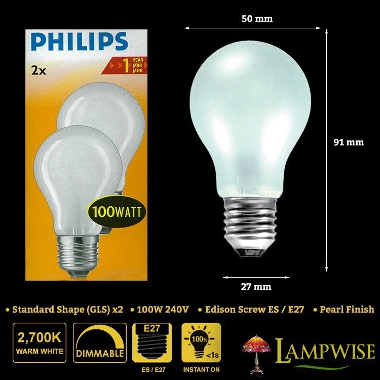 The original Philips 100 watt incandescent filament light bulb with a frosted glass finish.