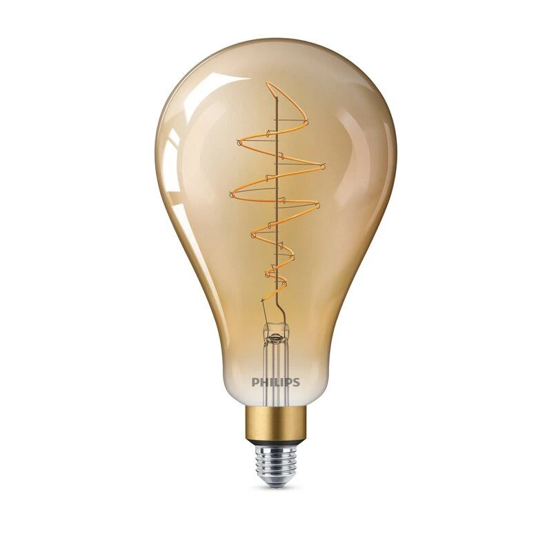 Philips modern LED technology giant filament light bulb with a decorative gold glass finish and extra warm white colour 2000K.