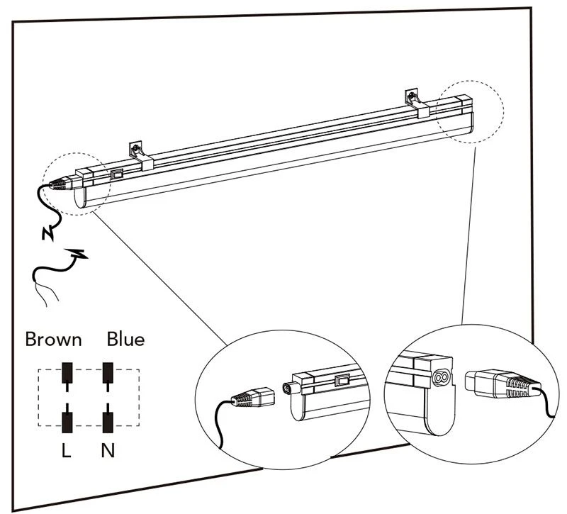 - Complete kit includes: fitting with male and female butt connectors; 1850mm plug-in power cord; 600mm linking cables and mounting clips