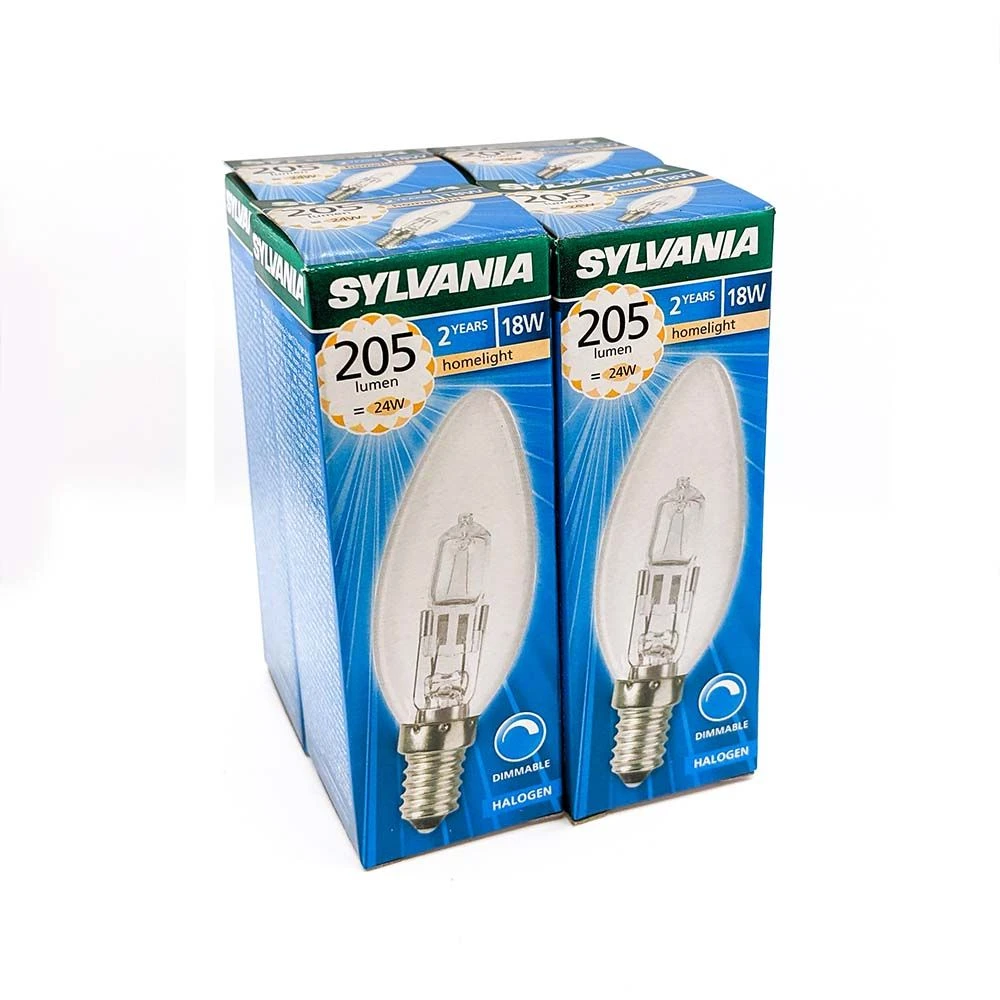 Sylvania branded eco halogen candle lamp rated at 18 W 220-240 V with E14 cap type. Suitable for conventional dimmer switches. Length 95 mm, width 35 mm.